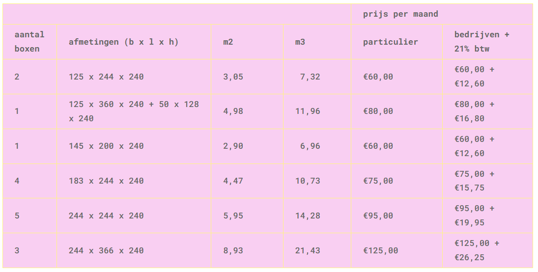 | aantal boxen | afmetingen (b x l x h) | m2 | m3 | particulier | bedrijven + 21% btw |